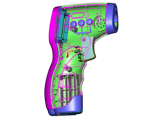 在體溫槍外(wài)殼塑膠製品的諸多製造工藝中,最(zuì)主要的就是注塑成型,而(ér)在注塑成型工藝(yì)中,最關鍵、最核心的部(bù)分就是體溫槍塑膠模具的設計和開發。