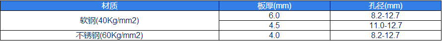 材質板厚(mm)孔徑(mm)軟(ruǎn)鋼(40Kg/mm2)6.08.2-12.74.511.0-12.7不鏽鋼(60Kg/mm2)4.08.2-12.7