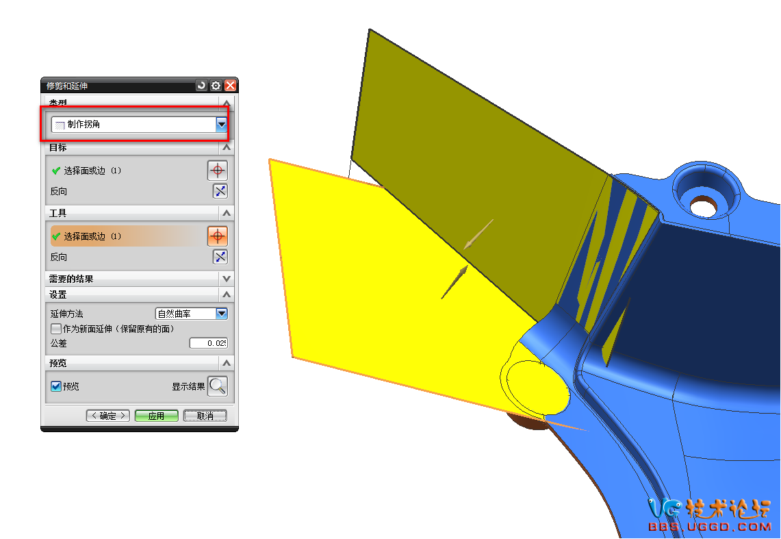 2.用“修剪和延伸”命令將兩個麵創建拐角,注意類(lèi)型(xíng)選擇製作拐角,結果如圖(tú)所示