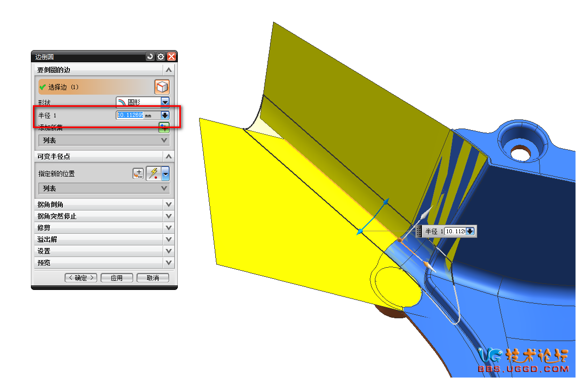 3.用“幾(jǐ)何屬性”命令測量兩個麵之間的R角是多少,並(bìng)且將R角的數據複(fù)製下(xià)來(lái),然後用“邊倒圓”命令將R角(jiǎo)倒上,粘貼R角的數據到半徑1對話框中,確定(dìng)